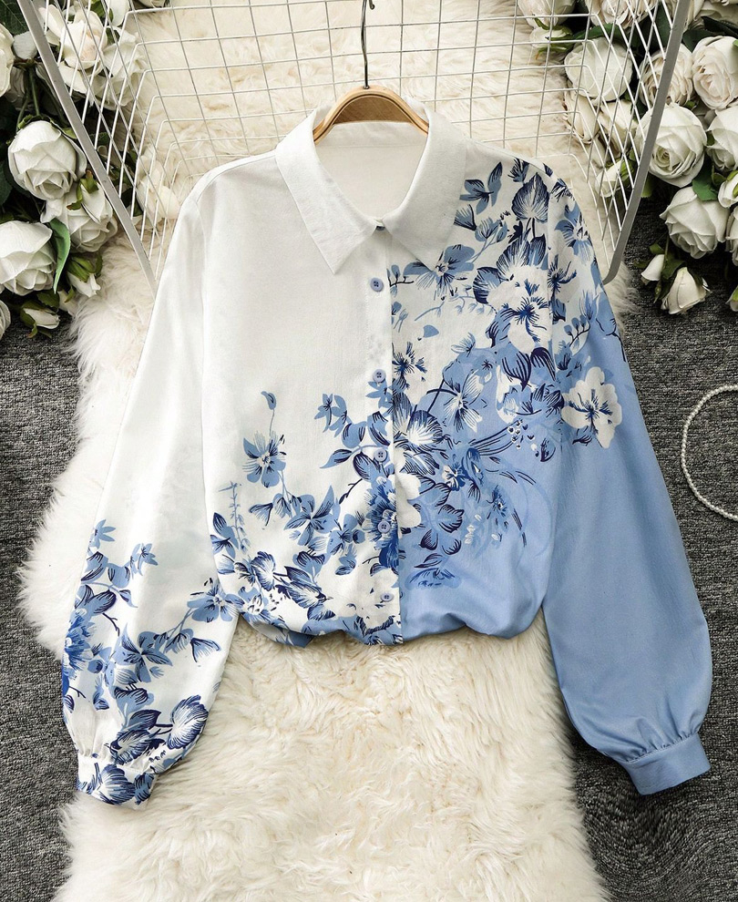A delicate button-down shirt with a dreamy floral gradient, transitioning from crisp white to a soft sky blue. The detailed blue blossoms give a romantic and fresh aesthetic, making it ideal for spring and summer outings.