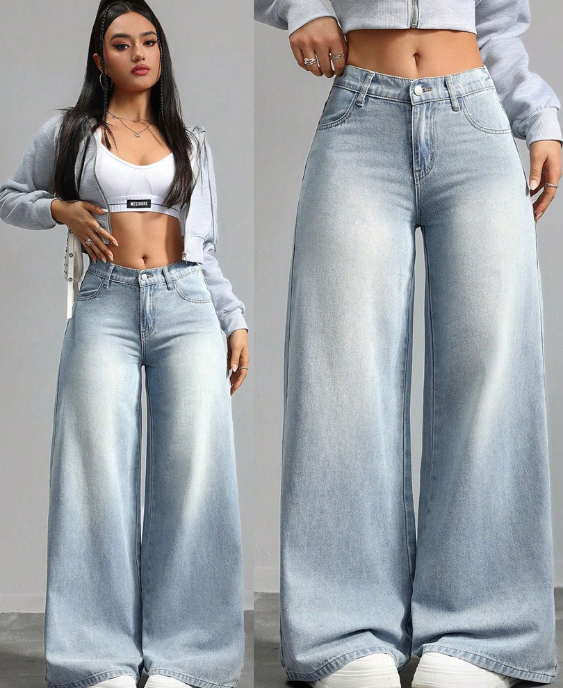 Faded blue wide-leg jeans with a gradient fade effect, adding a unique touch to the design