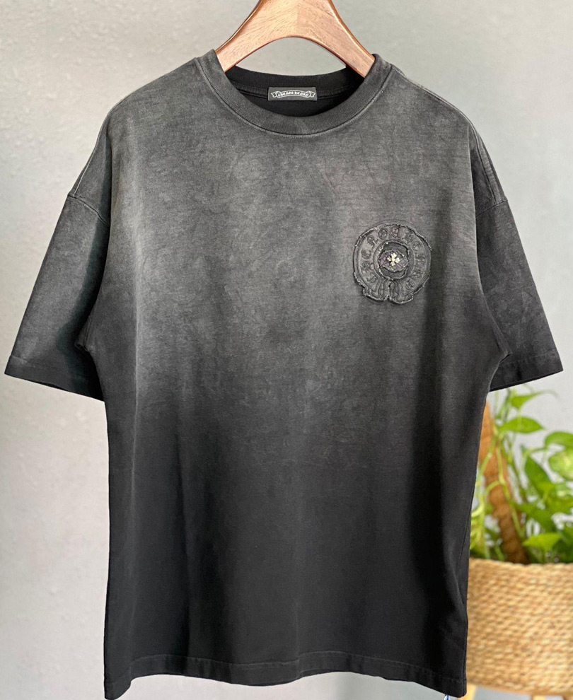 A gray T-shirt with a faded effect and a circular embroidered logo on the front, hung on a wooden hanger with a plant nearby.