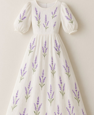 A charming white dress adorned with repeated lavender sprigs embroidery, creating a cottagecore vibe. The puff sleeves and gathered waist enhance its feminine and youthful silhouette.