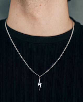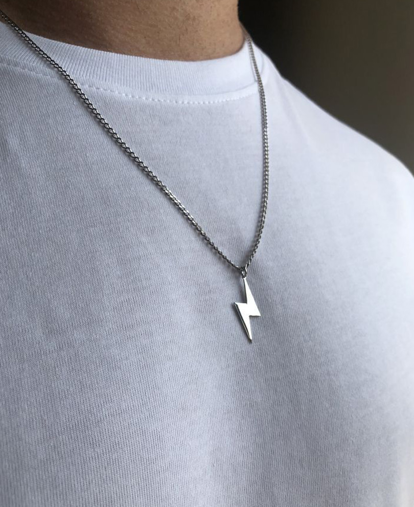 A striking silver chain necklace with a dynamic lightning bolt pendant, adding a bold and energetic touch.