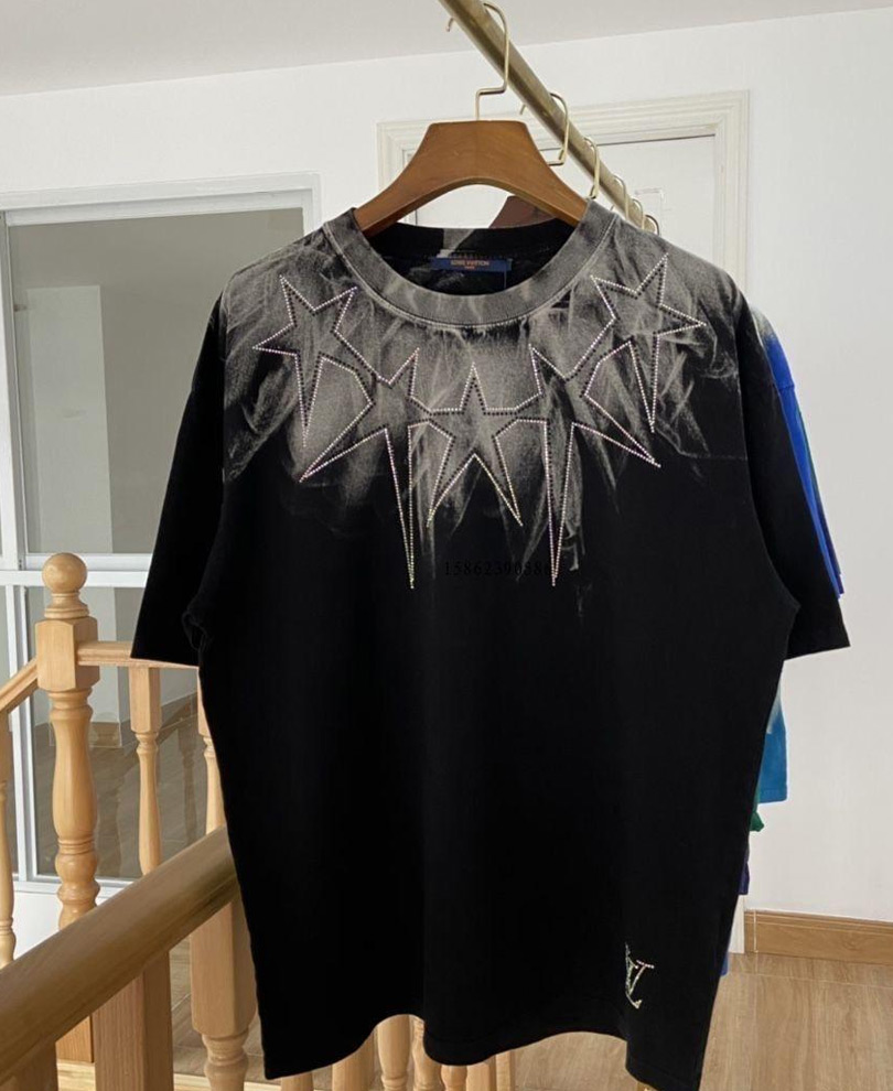 A black T-shirt with a distressed design featuring star-shaped embellishments and a subtle logo on the chest, hanging on a wooden hanger against a staircase background.